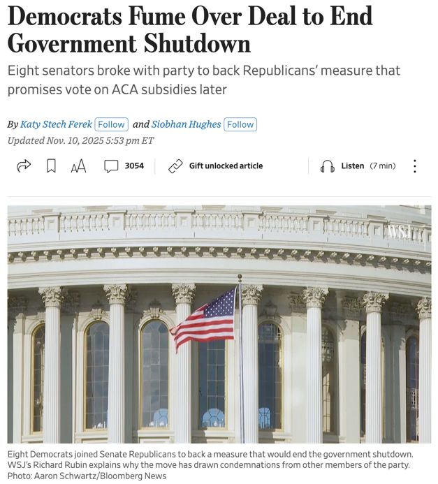 民主党放下了“开门必须捆绑延长ACA补贴”的先决条件,接受把医保补贴的争议推迟到12月用单列表决方式解决;这既给了温和派一个“先复工、后谈医保”的交代,但也难免招致党内对谈判筹码流失的质疑。