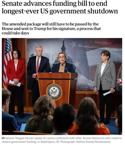 这意味着,参院终于按下了解锁按钮,为这场10月1日起至今持续40余天、创下历史纪录的联邦政府“停摆”提供了可见的解决路径。
